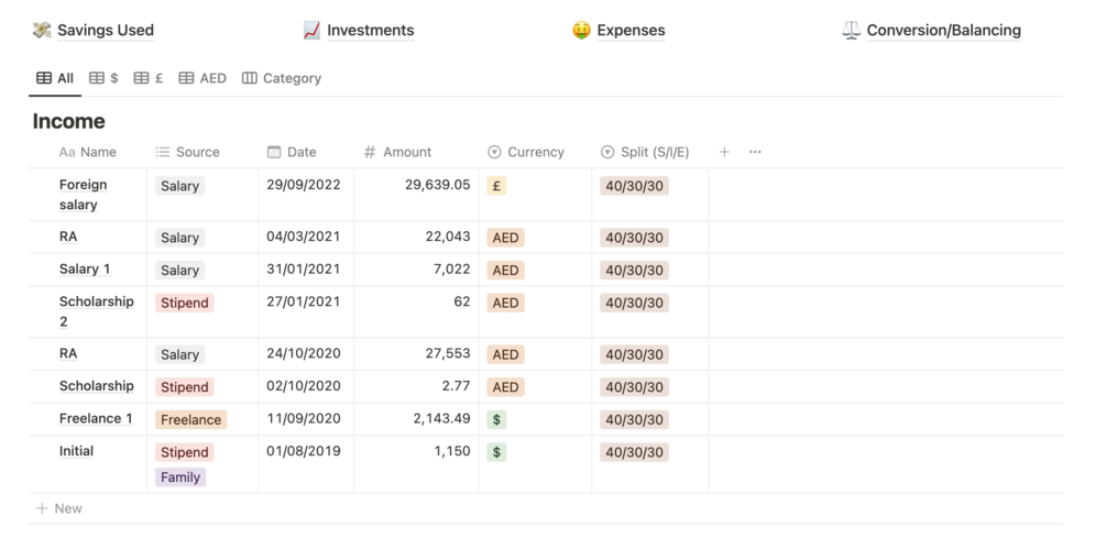 The Income section allows you to enter your income sources in multiple currencies. Users can add new income sources and edit existing ones. The split amount will divide the income across the three Savings, Investments and Expenses categories automatically. It has multiple views per currency and one for the sources.