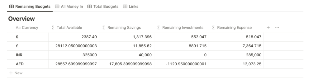 The Overview section provides a clear and concise summary of the user's finances. It includes an overview of your remaining total budget for investments, expenses, and savings. The links tab is where you select the relationships for the added expenses, investments, savings used and conversions.